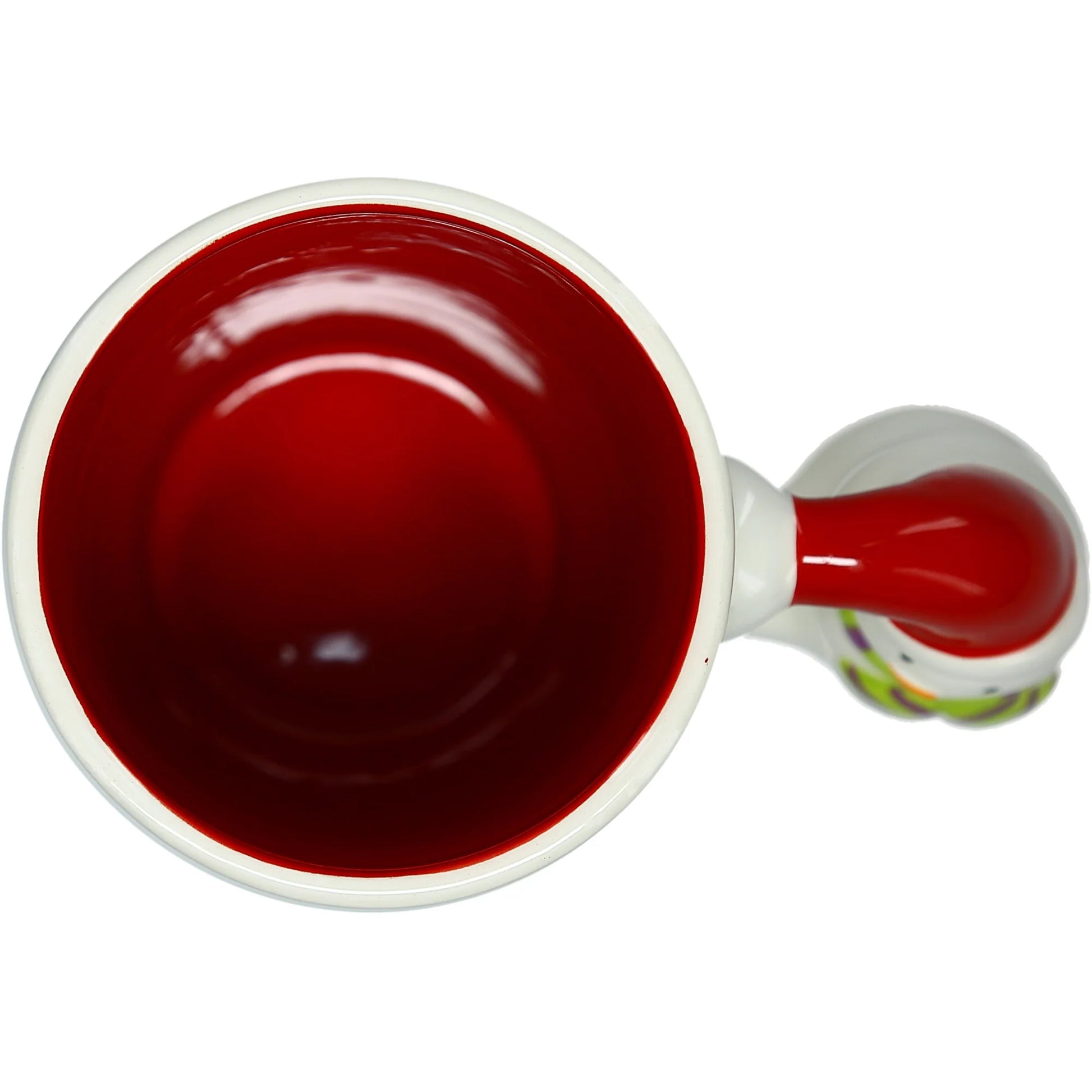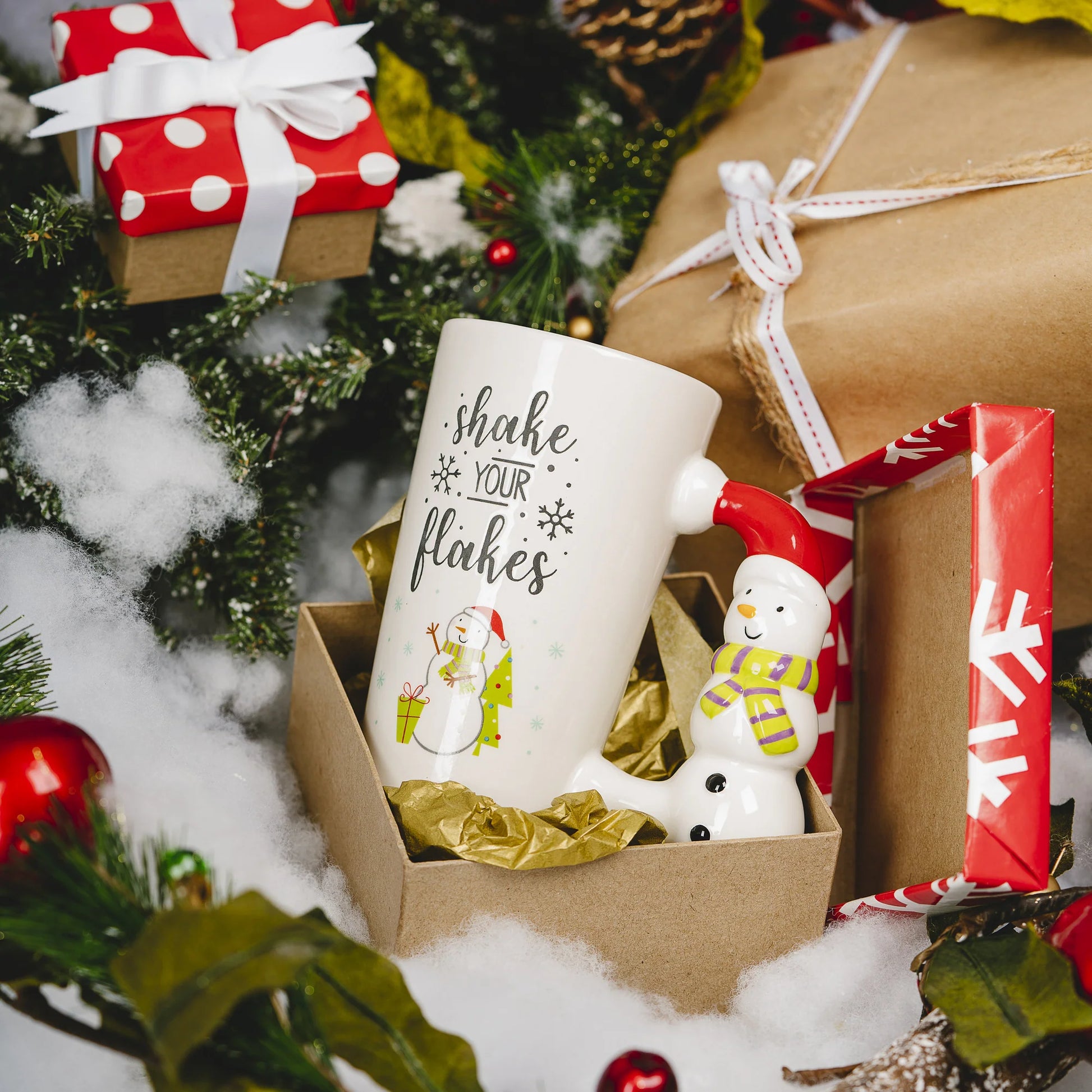 IN-HOUSE DESIGN: Features a debossed text decal on the front of the mug and a flat decal featuring a snowman, a present, and a tree displayed in the snow. The snowman-shaped handle has a 3d look, feels all the way around, and is hand-painted. The interior is red. These mugs come packaged in a protective die-cut box.